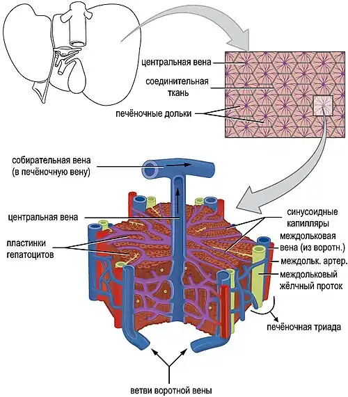 Микроскопическое строение печени напоминает соты, где каждая ячейка представляет собой печёночную дольку. Ряды гепатоцитов расположены в ней радиально, как спицы колеса велосипеда, таких рядов много, они уложены послойно (печёночными пластинками); роль стромы для гепатоцитов играют нежные волокна ретикулина (коллаген типа 3)[2].