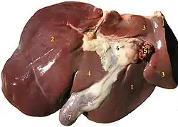 Печень состоит из двух долей: правой и левой. В правой доле выделяют ещё две вторичные доли: квадратную и хвостатую. По современной сегментарной схеме, предложенной Клодом Куино (1957), печень разделяется на восемь сегментов, образующих правую и левую доли. Сегмент печени представляет собой пирамидальный участок печёночной паренхимы, обладающий достаточно обособленным кровоснабжением, иннервацией и оттоком желчи. Хвостатая и квадратная доли, располагающиеся сзади и спереди от ворот печени, по этой схеме соответствуют SI и SIV левой доли. Помимо этого, в левой доле выделяют SII и SIII печени, правая доля делится на SV — SVIII, пронумерованные вокруг ворот печени по ходу часовой стрелки.