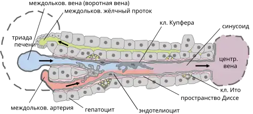 Между рядами (балками) гепатоцитов из междольковых вен, разветвляясь, к центру дольки следуют синусоидные капилляры, в них впадают артериолы, берущие начало из междольковых артерий. В центре дольки синусоидные капилляры впадают в центральную вену, которая впадает в собирательные, а затем в печёночные вены (притоки нижней полой вены). Синусоидные капилляры состоят из синусоидальных эндотелиоцитов и фагоцитирующих клеток Купфера. Эти капилляры имеют множество неплотностей и щелей, позволяя плазме проникать в перисинусоидальное пространство Диссе (между синусоидным капилляром и гепатоцитами). При этом гепатоциты непосредственно контактируют с плазмой, что является важнейшим условием для выполнения функций печенью[2]. В этом же пространстве располагаются клетки Ито (звёздчатые клетки печени).
