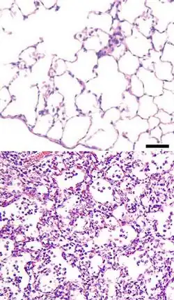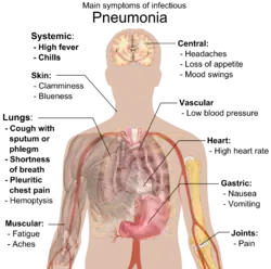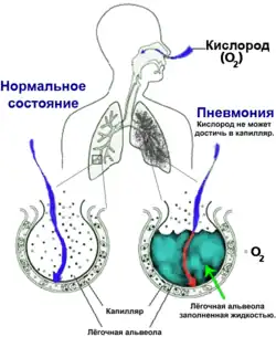 Пневмони́я (др.-греч. πνευμονία — «болезнь лёгких», от др.-греч. πνεύμων — «лёгкое»[2]), воспаление лёгких — воспаление лёгочной ткани обычно инфекционного происхождения с преимущественным поражением альвеол (развитием в них воспалительной экссудации)[3][4]. Пневмонии, вызванные инфекциями, являются формой острой респираторной инфекции, затрагивающей лёгкие[5]. Основными возбудителями пневмонии являются бактерии и вирусы, реже её вызывают микоплазмы, грибы и паразиты[6].