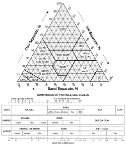 В мире также широко применяется определение механического состава почвы по треугольнику Ферре: по одной стороне откладывается доля пылеватых (silt, 0,002—0,05 мм) частиц, по второй — глинистых (clay, <0,002 мм), по третьей — песчаных (sand, 0,05—2 мм) и находится место пересечения отрезков. Внутри треугольник разбит на участки, каждый из которых соответствует тому или иному гранулометрическому составу почвы. Тип почвообразования при этом не учитывается.