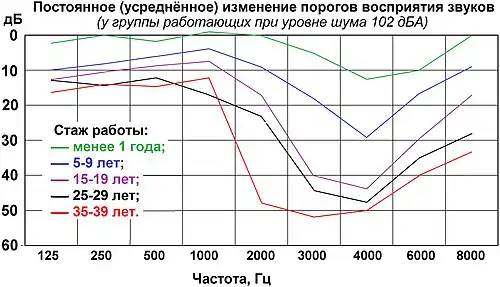 Максимум потерь слуха приходится на частоты, на пол-октавы выше (в 1,414 раза больше — прим.) воздействующего тона, однако при длительном воздействии зона влияния расширяется для всех тонов выше воздействующего. Показано, что наиболее неблагоприятными для органа слуха являются высокочастотные тоны 4000, 2000 и 1000 Гц (с. 103[4]). Исследование слуха в расширенном диапазоне частот (10 — 20 кГц) показало, что для лиц, подвергающихся воздействию интенсивного производственного шума независимо от его спектрального состава, наряду с известным ранним симптомом — повышением порога слуха на частоте 4000 Гц характерно также повышение порога на частоте 12 000 Гц и параллельное расположение кривых костного и воздушного звукопроведения (с. 112[4]).