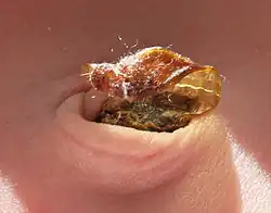 Мумифицированные остатки (культя) пуповины перед отпадением у семидневного новорождённого