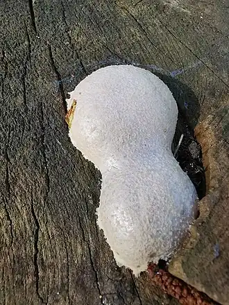 Спорофоры представляют собой эталии подушковидной или языковидной формы 2—8 см в диаметре и 0,5—1 см высотой. Они рассеяны по субстрату, в качестве которого может выступать гнилая древесина и отмершая кора деревьев. Эталии покрыты тонким и легко разрушающимся серебристым кортексом, который может становиться ржаво-коричневым при попадании на него рассеивающихся спор. Под неповреждённым спороношением хорошо заметен серебристо-белый тонкий гипоталлус. Со временем из-за попадания на него спор он становится незаметен. Псевдокапиллиций состоит из серии прикреплённых к основанию спорангия плёнчатых пластинок. От них к вершине отходят тонкие нити, обычно не прикреплённые к внутренней поверхности кортекса. Споры в массе ржаво-коричневые и светло-коричневые в проходящем свете. Обычно скоплений не образуют и имеют шаровидную форму. Диаметр спор 8—10,5 мкм. Около 2/3 поверхности споры занимает орнаментированная сеточка. Плазмодий кремово-белый[3].