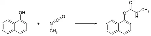 Севин получают при взаимодействии 1-нафтола с метилизоцианатом в присутствии тетрахлорметана[6]:
