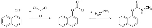 Также существует альтернативный метод получения, в котором 1-нафтол взаимодействует с фосгеном, полученный хлорангидрид α-нафтилугольной кислоты подвергают метилированию метиламином[7]:
