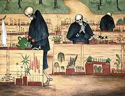 В искусстве образ смерти чаще всего представляют в виде костлявого существа (живого скелета) в чёрном балахоне с косой. В Европе до раннего Средневековья и начала монополии христианской церкви в вопросах погребения, индивидуализации смерти и превалирования христианских ритуалов над народными обрядами покойников изображали в виде иссушённых, обескровленных трупов. Постепенное усиление темы страха смерти и загробной жизни, призывов к покаянию, распространение макабра превратили образ смерти из высохшего тела в зловещий остов, живой человеческий скелет[15].