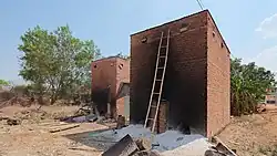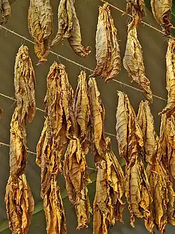 После уборки растения подвергают сушке и ферментации прямо на солнце или в особых помещениях с искусственным подогреванием, называемых огневыми сушилками. Ферментация табака идёт или одновременно с сушкой, или же до сушки, хотя в последнем случае эта операция требует более знаний и опытности вследствие возможности загнивания свежих листьев, сложенных в куче. Сушат табак в обыкновенных навесах или же специальных зданиях из кирпича или дерева с боковыми просветами, закрывающимися на случаи ненастья; навесы и здания делают сравнительно высокими ввиду того, что верхние партии дают сушёный продукт более добротным. С целью сушки листья табака нанизывают на бечевку или прутья и размещают в сушильнях. Сушка табака прекращается по уменьшении влажности листьев приблизительно до 18 %, затем весь высушенный материал складывается в кучи для ферментации. Сушку обыкновенно делят на три момента: в первом из них, связанном с некоторой ферментацией, обнаруживаемым в пожелтении или коричневом цвете листьев, происходит так называемое томление, приурочиваемое к температуре 40 °С; во второй момент происходит уже собственно сушка табака при температуре 77—100 °С; в третий период высыхают уже черешки и прожилки листьев. Для окончательной ферментации высушенные листья сваливают в кучи, затем после ферментации мелкие кучи соединяют в более крупные, в которых табак и сохраняется в течение нескольких лет, если принуждают к этому обстоятельства; здесь следует заметить, что от подгнивания, иногда замечаемого в кучах, обсыпки и могут достигать 30 % и более[9][11].