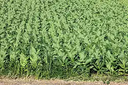 Поле под табак подготовляется возможно тщательно. Если табак вводится в севооборот, то осенью следует произвести две и даже три вспашки с бороньбой в промежутках между вспашками; вторая вспашка должна быть самая глубокая, до 30 см, но две последние вспашки можно произвести и весной, но уже во избежание иссушения почвы на меньшую глубину. Удобрения под табак вносятся обыкновенно в несколько приёмов, например при первой вспашке, затем при второй, глубокой, а в случае бедности почвы даже и при весенней вспашке. Время пересадки растений должно быть приноравливаемо в каждой местности и к особенностям её климата. Пересаженные из рассадника растения располагают квадратом или прямоугольником с одинаковыми промежутками между растениями и рядами; иногда растения располагают в шахматном порядке; последний требует хотя больше труда и затрат, но зато предоставляет растениям более удобств в отношении света, свободы развития отдельных частей и пр., отчего увеличивается и урожай продукта; последнего можно достигнуть, конечно, и более частым распределением растений в поле, но зато в этом случае ухудшается качество табака, с чем приходится считаться на рынке. Пересаженные растения требуют на первых порах поливки и мотыжения, то и другое производится неоднократно в течение лета; последней операцией достигается улучшение физических свойств почвы, а также уничтожение истощающих поле сорных трав. Мотыги употребляются для этой цели или ручные, или же механические; последующей операцией при уходе за табачным полем следует присыпка земли к нижним частям растения, но по причине загрязнения нижних листьев растения иногда высаживают в поле, предварительно разработанное в холмики, где уже подвергают их мотыжению[9].