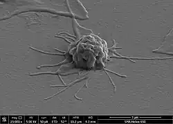Активированный тромбоцит на стекле с иммобилизованным фибриногеном. Сканирующая электронная микроскопия.