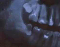 - Перелом нижней челюсти: осложнение весьма редкое и бывает при удалении нижних 7—8-х зубов с объёмными кистами под корнем, при остеопорозах, при применении значительной силы в процессе операции удаления зуба.
