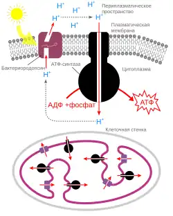 - Хромофор бактериородопсина ретиналь поглощает кванты света, что приводит к конформационным изменениям в структуре бактериородопсина и транспорту протона из цитоплазмы в периплазматическое пространство. Таким образом, в результате работы бактериородопсина энергия солнечного излучения трансформируется в энергию электрохимического градиента протонов на мембране.