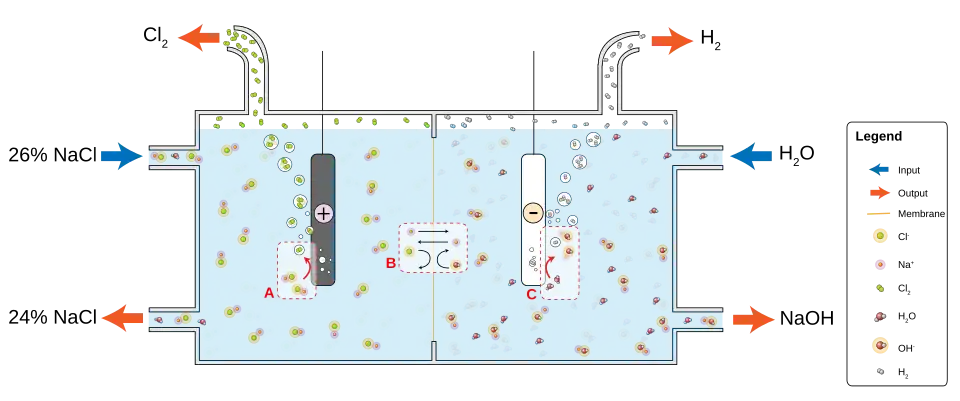 С точки зрения электрохимических процессов мембранный метод подобен диафрагменному, но анодное и катодное пространства полностью разделены непроницаемой для анионов катионообменной мембраной. Поэтому в мембранном электролизёре, в отличие от диафрагменного, не один поток, а два.