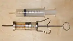 ![Стеклянные многоразовые шприцы типа Люэра с кончиком и поршнем из стекла[6] применявшийся до широкого внедрения одноразовых пластиковых, в которых обычно использованы разновидности кончика типа Люэр[7]](./SyringeAllGlass.jpg)