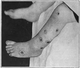 Эктима — бактериальная инфекция кожи, которая начинается с пузырька, покрывающегося коркой[1]. Если корка отпадёт, могут образоваться чётко очерченные язвы размером до 3 сантиметров[1][4]. Также могут становиться крупными лимфатические узлы[1]. Чаще всего поражаются ноги[4]. К осложнениям относятся целлюлит и постстрептококковый гломерулонефрит[2].