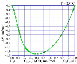 С водой этанол смешивается в произвольном отношении, при смешивании наблюдается значительное, до нескольких процентов уменьшение объёма смеси относительно исходного суммарного объёма чистых веществ, например, при смешивании 50 мл этанола с 50 мл воды образуется 97 мл раствора. Также смешивание сопровождается некоторым нагреванием смеси.