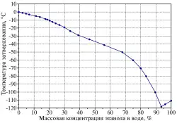 Абсолютный этанол затвердевает при температуре −114,5 °C[11]. Температура плавления смесей этанола с водой уменьшается при увеличении концентрации этанола в растворе и достигает минимума при массовой концентрации этанола в воде равной 93,5 % — эвтектики этанол-вода, имеющей температуру плавления −118 °C[12]. При низких температурах, ниже −20 °С водный раствор этанола (96 %) практически не испаряется и превращается в вязкую жидкость. При −70°C он становится ещё более вязким и по текучести напоминает густой мёд.
