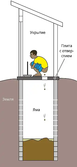 Ямная уборная или ямный туалет — это тип туалета, в котором человеческие фекалии собираются в яму, вырытую в земле. При этом вода либо совсем не используется, либо, если ямная уборная оборудована сливом, расходуется в объёме от одного до трёх литров на один слив[2]. Правильно построенные и обслуживаемые ямные уборные помогают предотвращать распространение заболеваний благодаря уменьшению количества человеческих фекалий, попадающих в окружающую среду вследствие открытой дефекации[3][4]. Использование таких уборных снижает риск попадания в пищу патогенов, которые переносятся мухами с фекалий[3] и являются главной причиной инфекционной диареи и заражения кишечными глистами[4]. Но, такой вид туалета, в отличие от более удобного в использовании унитаза, не является надёжной защитой испражнений от контакта с окружающей средой. В 2011 году инфекционная диарея стала причиной гибели около 0,7 миллиона детей в возрасте до пяти лет, а также причиной пропуска школьниками 250 миллионов учебных часов[4][5]. Ямные уборные — самый дешёвый способ оградить людей от контакта с фекалиями[3], но существенно менее надёжный и удобный, чем унитазы, подключенные к канализации. Ночью и зимой в холода использование такого туалета затруднено, при минусовых температурах содержимое ямы замерзает, использование этого туалета по сравнению с унитазом очень неудобное, поэтому у владельцев таких туалетов всегда есть ночные горшки. В городах этот вид туалета почти полностью вытеснен унитазом и писсуаром, как более гигиеничными, удобными, технологичными и прогрессивными средствами отправления естественных нужд. Продолжает иметь место в деревнях и сёлах, из-за отсутствия в них системы канализации в большинстве случаев.