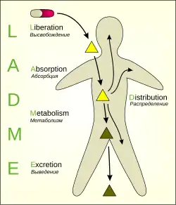 Соединения начинают разрушаться, как только они попадают в организм. Бо́льшая часть метаболизма мелкомолекулярных лекарств осуществляется в печени окислительно-восстановительными ферментами, называемыми ферментами цитохрома P450. В процессе метаболизма исходное (родительское) соединение преобразуется в новые соединения, называемые метаболитами. Когда метаболиты фармакологически инертны, с помощью метаболизма дезактивируется введенная доза исходного препарата, что обычно снижает его воздействие на организм. Метаболиты также могут быть фармакологически активными, иногда более активными, чем исходный препарат (см. пролекарство).