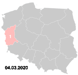 9 марта в Польше насчитывалось 17 инфицированных (в том числе первый случай инфицирования зарегистрирован в Великопольском воеводстве)[39]. 10 марта проинформировано о 5 новых случаях инфицирования новым коронавирусом, в том числе первый случай зарегистрирован в Люблинском воеводстве[40]. 11 марта сообщено о 9 новых случаях инфицирования коронавирусом, в том числе впервые в Опольском и Лодзинском воеводствах.[41]