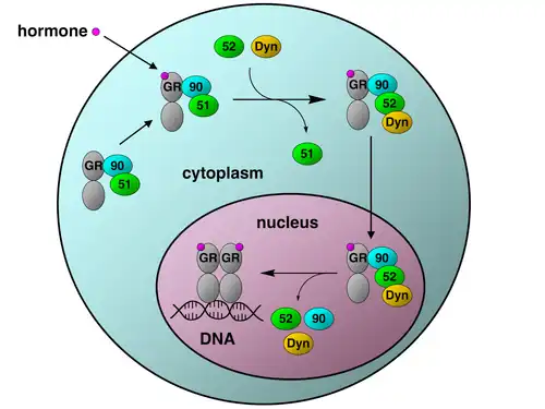 Глюкокортикоидный рецептор (GR) является наиболее тщательно изученным примером стероидного рецептора, функция которого в решающей степени зависит от взаимодействия с Hsp90[48][49]. В отсутствие кортизола — стероидного гормона, GR находится в цитозоле, в образованном комплексе с несколькими белками-шаперонами, включая Hsp90 (см. Рисунок справа). Эти шапероны поддерживают ГР в состоянии, способном связывать гормон. Вторая роль Hsp90 заключается в связывании иммунофилинов (например, FKBP52), которые присоединяют комплекс GR к пути распространения белка динеина, который транслоцирует (переносит) активированный рецептор из цитоплазмы в клеточное ядро[50]. Один раз в ядре GR димеризуется и связывается с определёнными последовательностями ДНК и тем самым усиливает экспрессию GR-чувствительных генов. Hsp90 также необходим для правильного функционирования ряда других стероидных рецепторов, в том числе ответственных за связывание альдостерона[51], андрогена[52], эстрогена[53] и прогестерона[54].