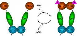 С-концевой домен обладает альтернативным сайтом связывания АТФ, который становится доступным, когда занят карман Бержерата N-конца белка[25][26].