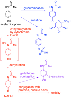 У взрослых основным путём метаболизма парацетамола является глюкуронизация[1]. Это создает относительно нетоксичный метаболит, который выделяется с желчью и выводится из организма. Небольшое количество препарата метаболизируется через путь цитохрома P-450 в NAPQI, который чрезвычайно токсичен для ткани печени, а также является сильным биохимическим окислителем[1]. У среднего взрослого человека вырабатывается лишь небольшое количество NAPQI (примерно 10% терапевтической дозы парацетамола), который инактивируется конъюгацией с глутатионом.