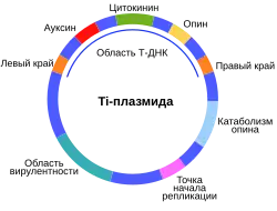 20. Ti-плазмида (Ti-plasmid, tumor inducing plasmid) — Плазмида почвенной бактерии Agrobacterium tumefaciens, специфический Т-участок которой способен включаться в клетки двудольн … Дата обращения: 16 августа 2008. Архивировано 6 января 2011 года.