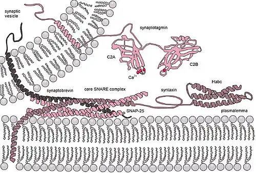 Белки SNARE являются небольшими, но широко-представленными мембранными белками. Несмотря на большую разницу в структуре и размере эти белки объединяет наличие одного и того же цитозольного домена из 60—70 аминокислот, называемого SNARE motif (или SNARE домен), способного к образованию обратимой, но прочной четырёхспиральной сцепки. Такой метастабильный транс-SNARE комплекс включает синтаксин 1 и SNAP-25, находящиеся на клеточной мембране, и синаптобревин на поверхности доставляемой пресинаптической везикулы. Синтаксин и синаптобревин связаны с мембраной С-конечным фрагментом и предоставляют по одной альфа-спирали в четырёхспиральную сцепку комплекса. SNAP-25 заякорен на мембране за счёт пальмитоильных ацильных цепей и обеспечивает две оставшиеся альфа-спирали.