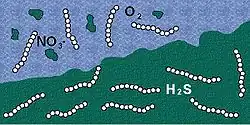 Thiomargarita namibiensis — хемолитотрофная бактерия, которая может использовать нитрат как конечный акцептор электронов в электрон-транспортной цепи. Она окисляет сульфид (S2-), служащий донором электронов, до элементарной серы (S0), которая откладывается в периплазме в виде хорошо преломляющих свет матовых гранул, делающих клетку похожей на жемчужину. Общее уравнение окислительно-восстановительной реакции, протекающей в клетках Thiomargarita namibiensis: